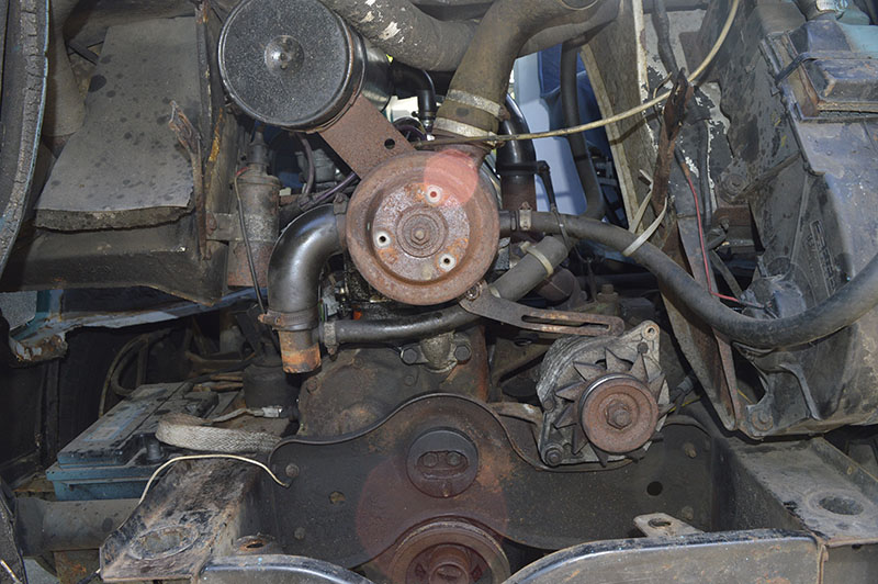 De waterpomp is gereviseerd. Oorzaak van het harde geruis van het bronzen lagertje was dat het olievulnippeltje geheel verstopt zat. Dus ook al ging hier af en toe een druppeltje in, het kwam niet bij het lager. Uiteindelijk beide lagers vervangen en de waterkering, nu de zaak toch open ligt. De opsluitmoer van het voorste kogellager zat erg vast. Hiervoor heb ik een speciale sleutel gemaakt. Tevens de waterslangen en de thermostaat vervangen, de bobine schoongemaakt en geverfd (kon ik nu gemakkelijk bij). Tenslotte de radiateur hier en daar wat ontroest en in de (blanke) tectyl gezet.