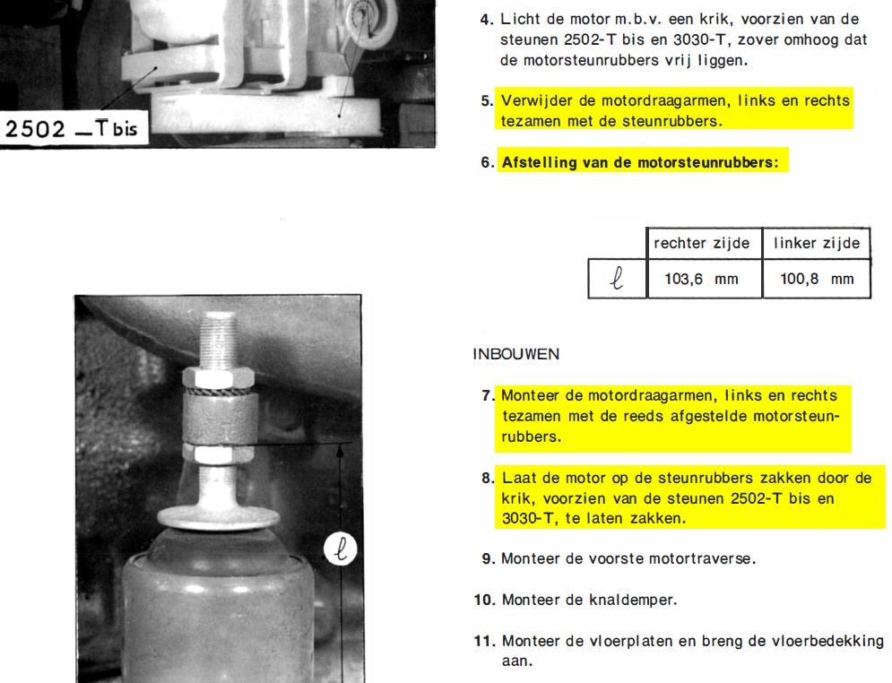 7. Monteer de motordraagarmen, Iinks en rechts tezamen met de reeds afgestelde motorsteunrubbers.
