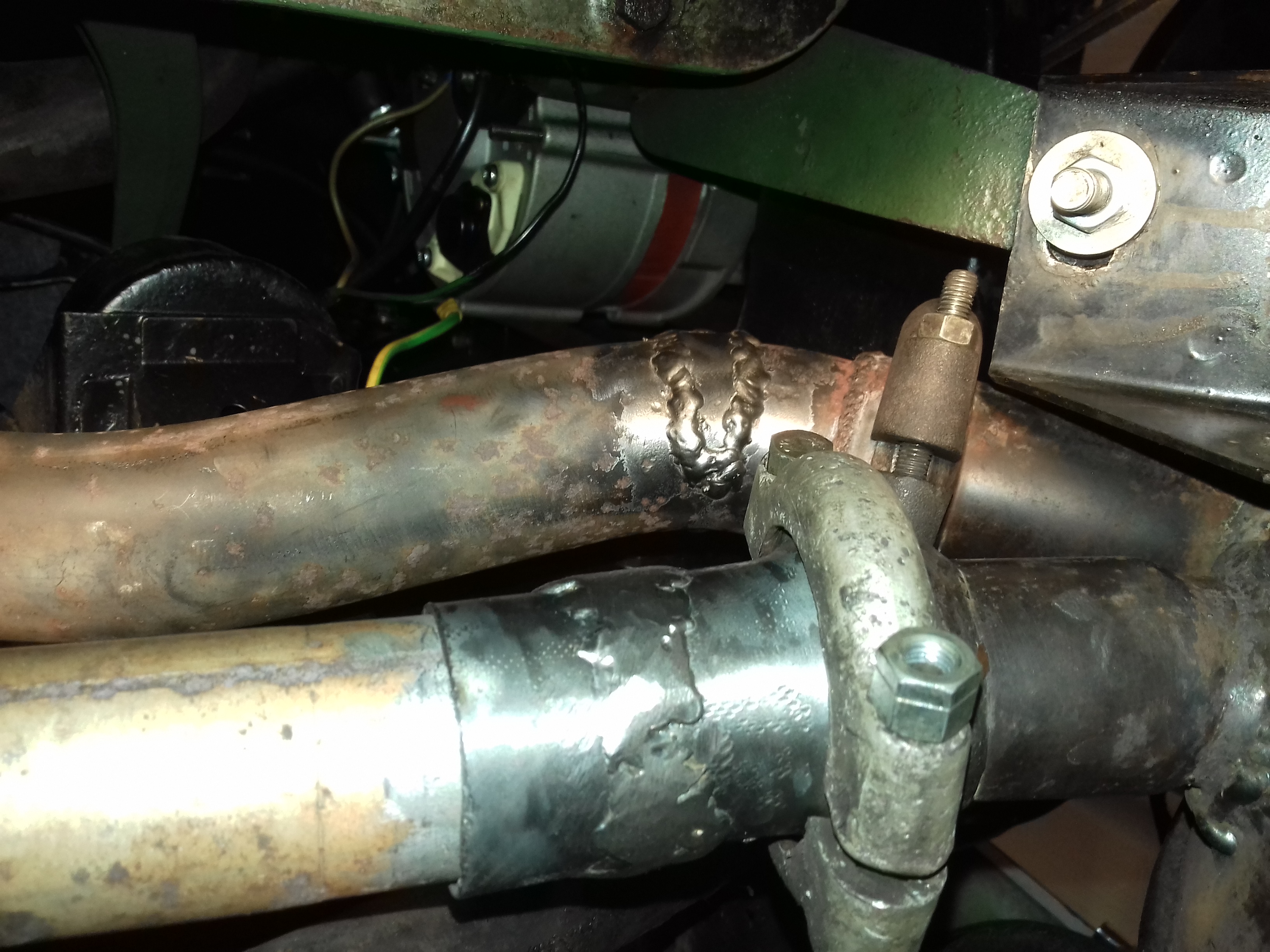 ik ben toevallig juist bezig met herstel van plaatwerk rondom de doorvoer van de uitlaatpijp, zij het op bescheiden schaal. Met paard er (nog) uit is dat inderdaad gemakkelijker. Aanvankelijk had ik het verroeste stuk er uit voldoende uitgesneden, dacht ik , maar bij het lassen vielen er toch gaten in; derhalve is het gat 2x zo groot geworden als op de foto te zien is, opgevuld met een tweede stukje plaat.