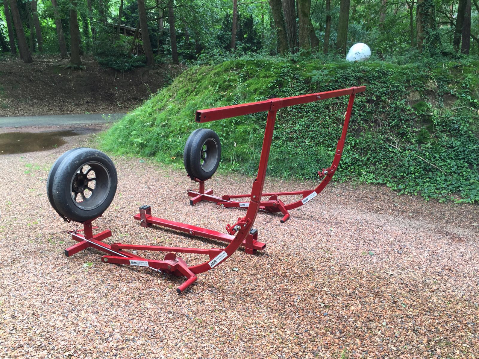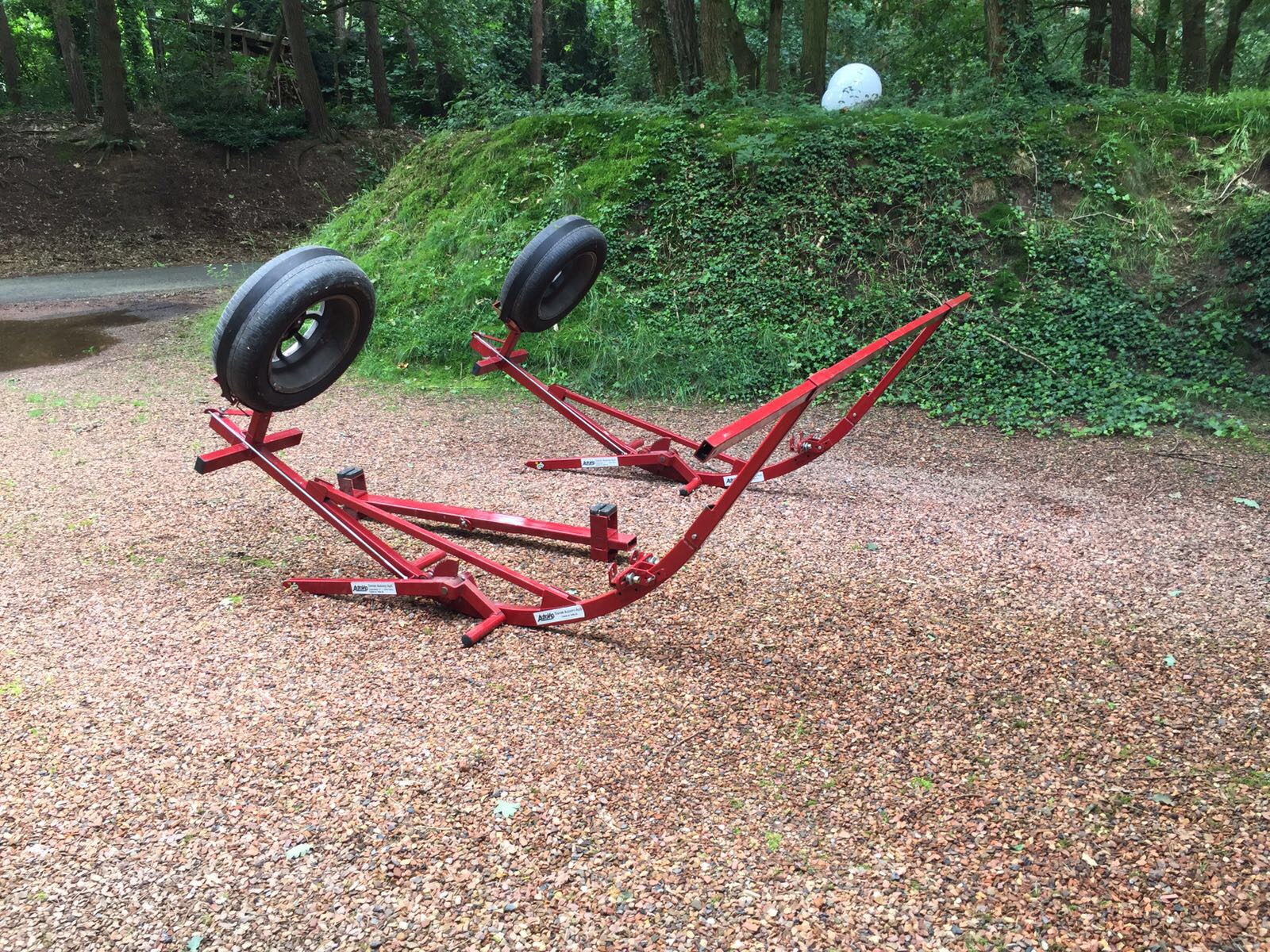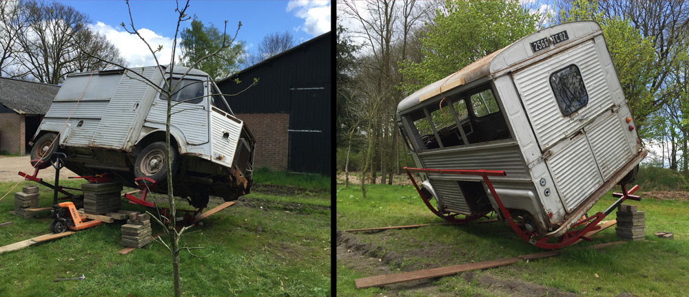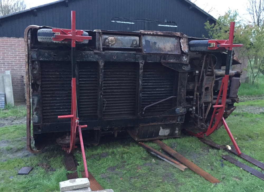 De beugels onder de bus geplaatst en op zijn kant gezet.