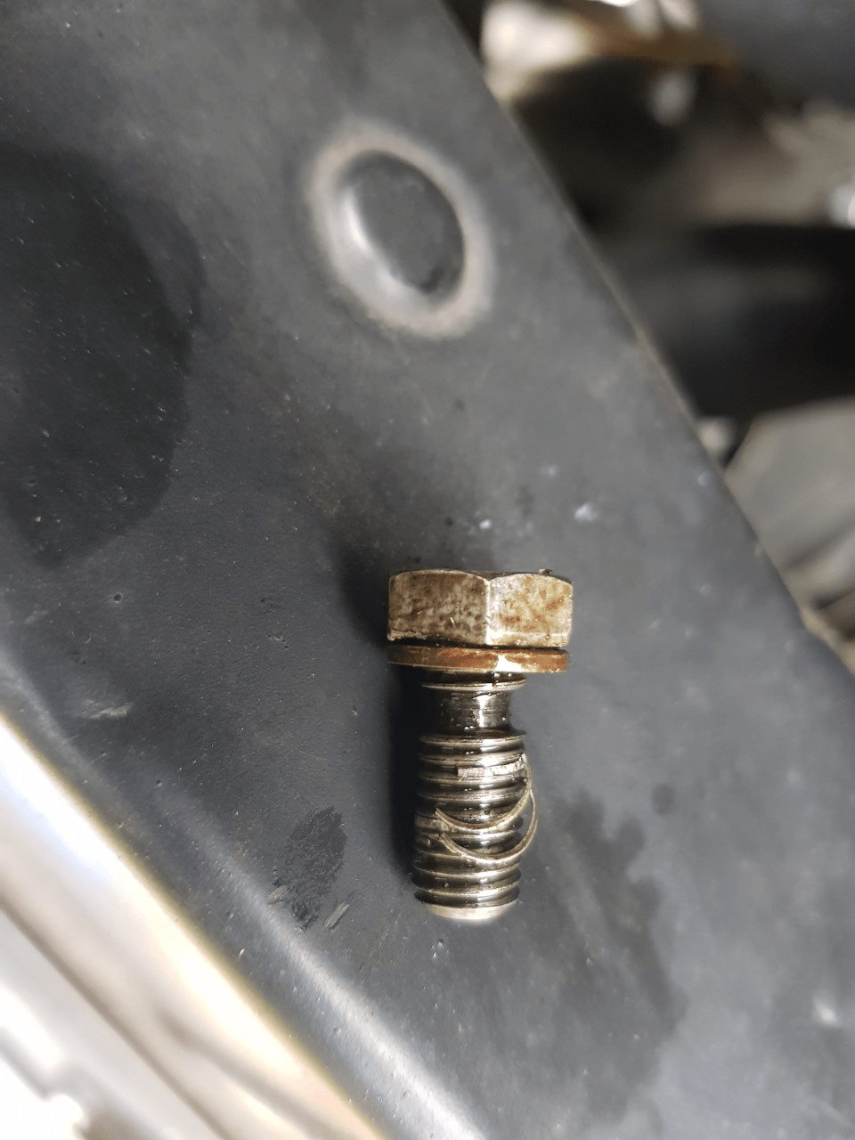 Een kant van mijn motor (bij de ontsteking) zit de afgelopen maanden onder een laagje olie. Bij nadere bestudering lijkt het van dat externe olieleidinkje af te komen. De onderste bout bleek goed vast te zitten. De bovenste bleek echter dol gedraaid (zonder dat ik kracht heb uitgeoefend overigens). Ik kan hem dus niet vastdraaien. Bij het verwijderen van de bout zaten er halve ijzeren ringetjes omheen (zie foto). Bij terugzetten van de bout is hij, vanzelfsprekend, nog steeds dol. Het lekt tijdens het rijden aanzienlijk.