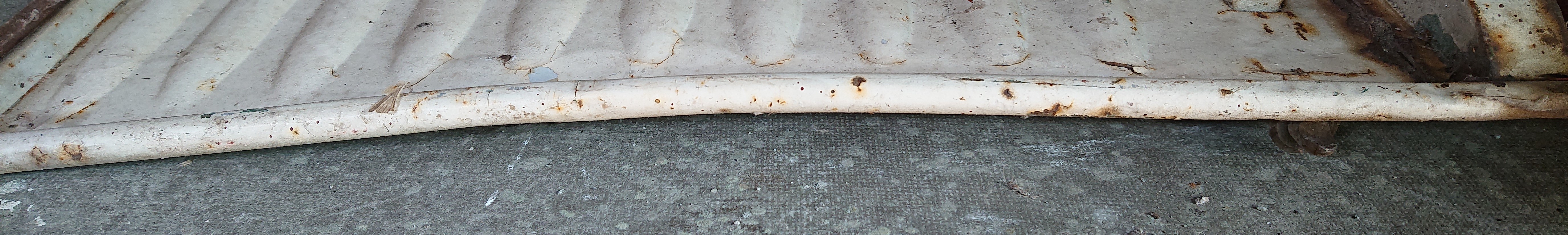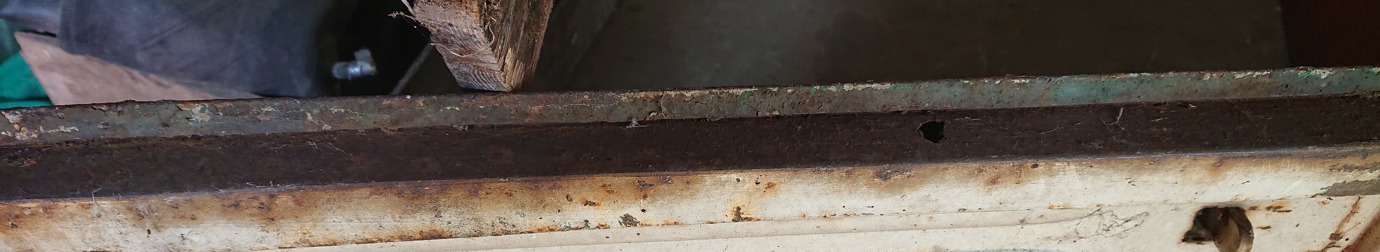 Met wat geduld is de buiging goed weg te krijgen. Er zit geen knik in dus door rustig tegendruk (en verdeeld over de hele lengte) te geven en vervolgens iets door te drukken moet het goed gaan. Ik zou het kunnen doen, maar zeker nu in het voorjaar en met het opnieuw opstarten van het restaurant is daar geen tijd voor helaas. Het omega-profiel is erg roestig maar over de hele lengte echt hard, buiten dat ene gat aan de onderzijde. Aan de bovenzijde zitten twee gaatjes van minder dan een millimeter, maar die lijken ergens anders door te zijn ontstaan, niet door roest, alsof het een schroefgaatje is, maar dan wel van een heel klein schroefje. Het staal eromheen is namelijk niet doorgeroest.