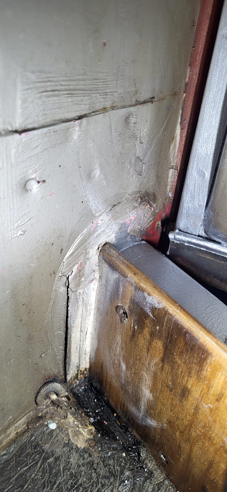 Onlangs constateerde ik in de cabine onderstaande scheur in de hoek achter de linker-rijstoel. Er zit geen roest en het rondom aanwezige plaatwerk is hard. Het lijkt er dus op dat door torsie-krachten deze scheur ontstaan is.
