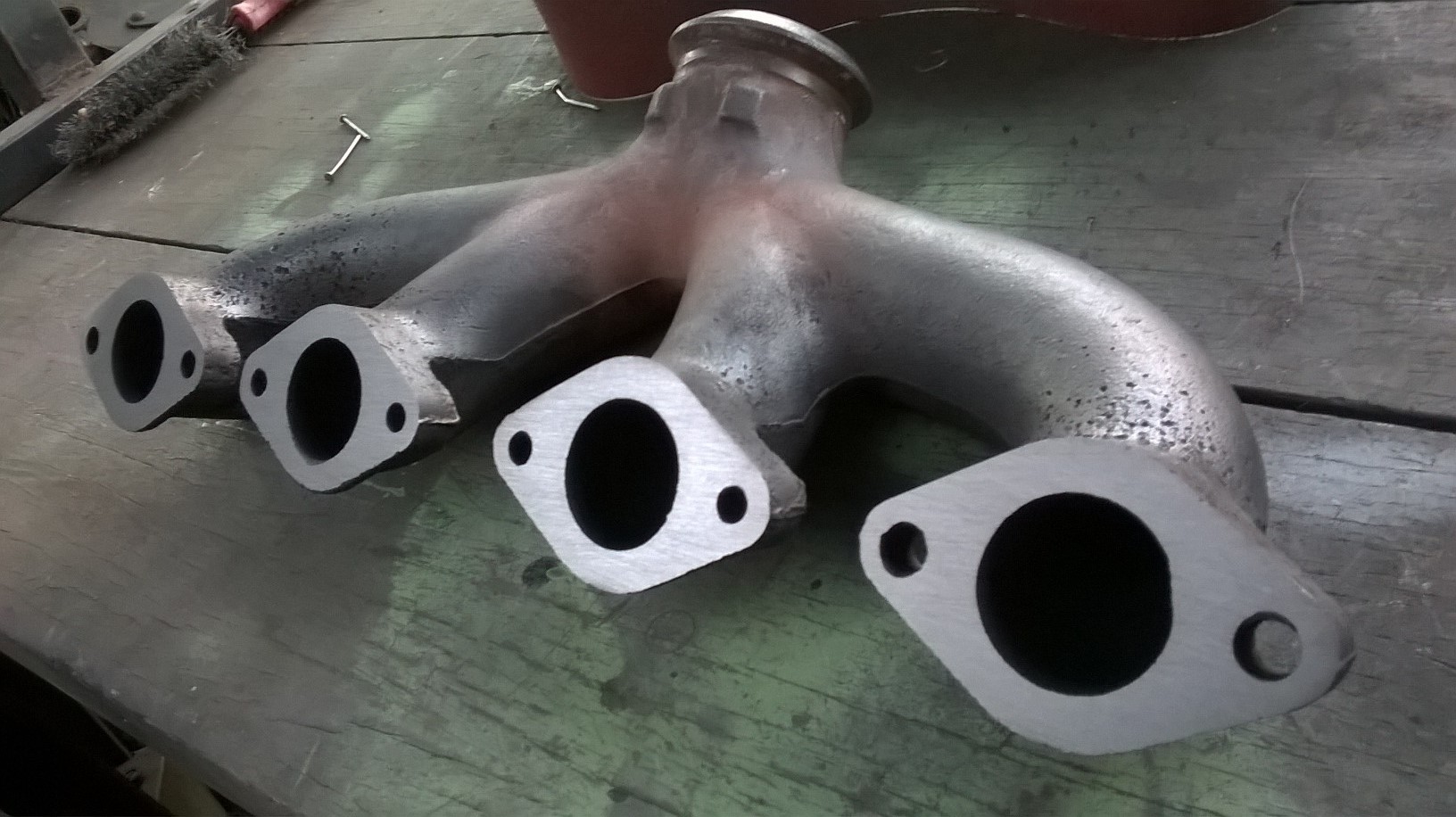 Ik kocht twee metaalschuurbanden korrel 40 en korrel 100, sneed die open en spijkerde deze vast op de werkbank. En ben dan als een bezetene een uur met dat spruitstuk aan het schuren geweest. Na een paar minuten zagen de drie evenwijdige pijpen er al vlak uit, alleen die ene bewuste flens raakte zelfs nog geen schuurkorrel... dus blijven blijven blijven schuren... ik heb dus eigenlijk manueel van drie pijpen 1,0 mm staal afgeschuurd met de hand, en van de vierde uiteindelijk ongeveer 0,5mm. En toen zag het er perfect uit! Ik voel het nog in mijn knoken.