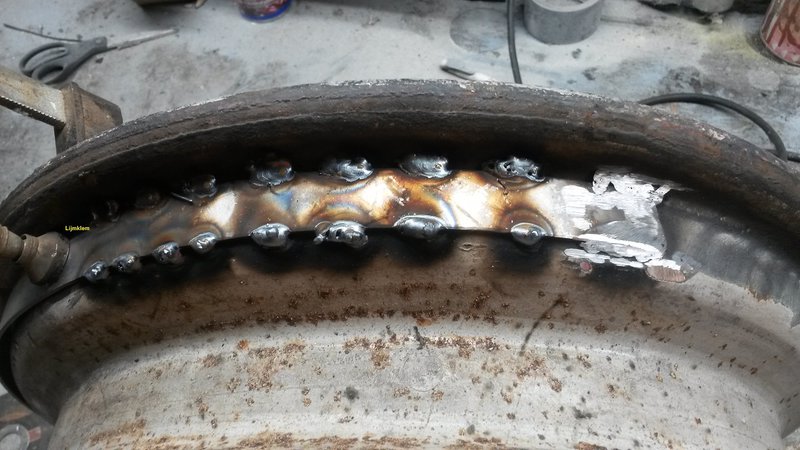 Hierna is de velg / strip overgang glad geplamuurd met staalplamuur zodat de band straks mooi over de gelaste ring kan schuiven