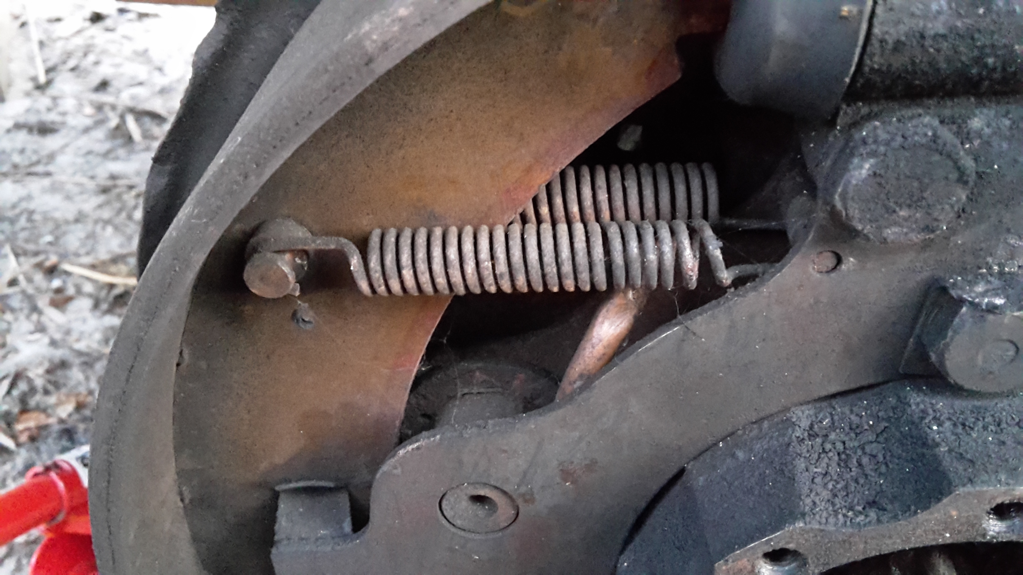 Hoe krijg ik die achterste veer los? (zie foto) Moet je toch wat loshalen / heb je daar speciaal gereedschap voor of moet dat lukken met een lange schroevendraaier?Gewoon de veren los en de remschoen naar buiten trekken/ scharnieren en dan kun je er bij.
