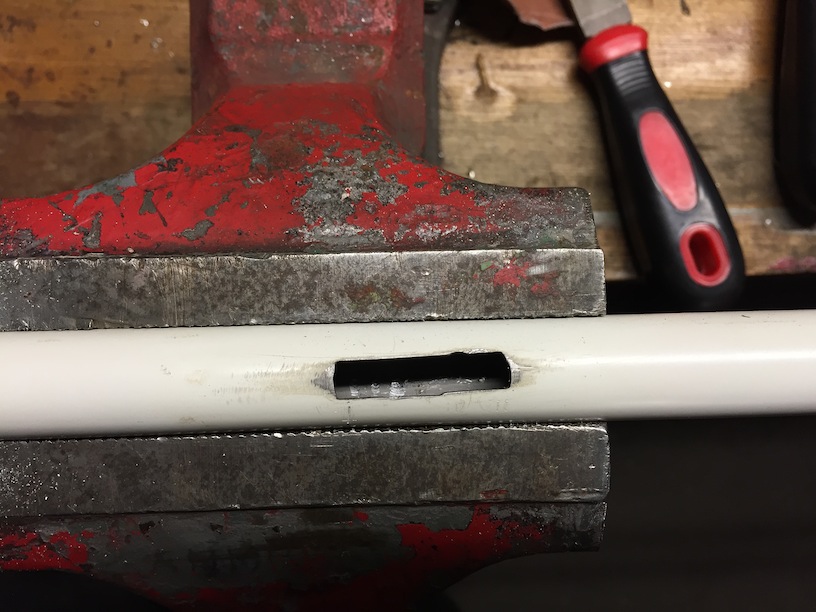 Met meten zag ik niet veel verschil, ik meende het stukje te kunnen zien waar het misging, dus schuurpapier gepakt en voorzichtig de bus inwendig gaan schuren. Voorzichtig beetje bij beetje om te voorkomen dat die stang straks toch weer 'los' in de bussen hangt