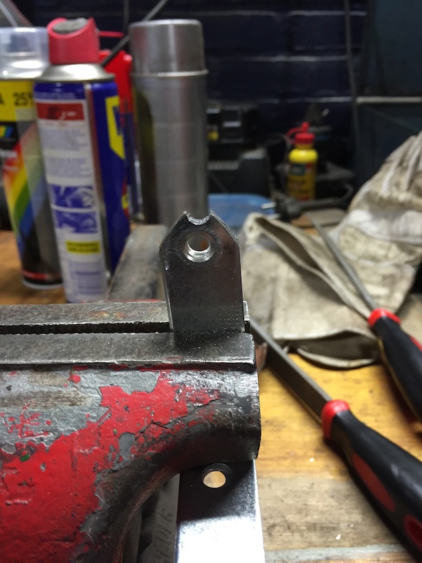 Na een halve dag schuren en passen is het uiteindelijk gelukt. Hij past net goed genoeg zodat de veer de pook kan terug duwen.