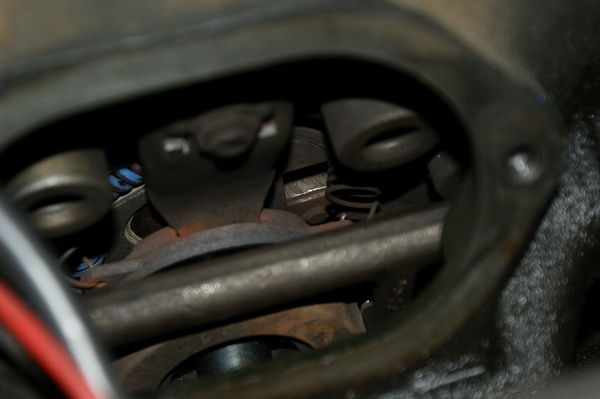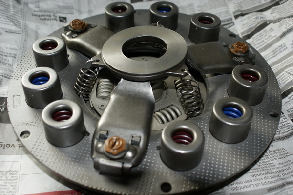 Je krijgt inderdaad ervaring met in- en uitbouwen van de motor. Vorige week in een paar uurtjes alles los, daarna met hulp van Fons en zijn palletwagen de motor er onderuit. Binnen de drukgroep en koppelingsplaat er af. De verloren veer zat in een hoek van 90 graden gevouwen en blokkeerde zo de drukgroep.
