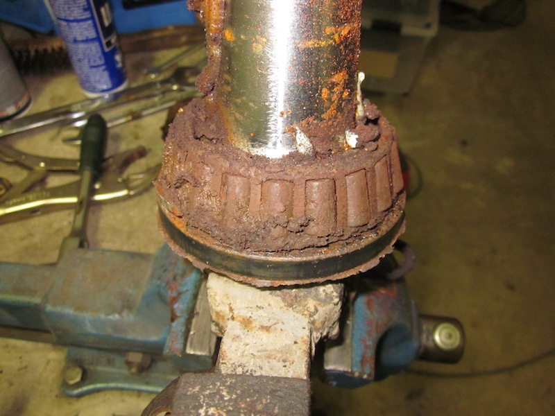 Op de foto's kan je zien dat de lagerkooi erg verroest is en er veel roestdrab tussen zit. Ook de lagerschalen zijn erg aangetast.