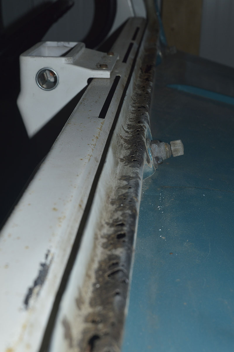 Ik had al gemeld dat ik lekkage had in de schuifla in het dashboard. meest voor de hand liggende oorzaak leek toch wel de voorruit. Vandaag heb ik deze verwijderd. Dat ging gemakkelijker dan ik had gedacht en hier en daar had gelezen. Vanaf de bovenhoeken het raamrubber loswerken en achter het frame werken met een stompe schroevendraaier, richting het midden. Zo ook vanaf de hoeken naar beneden en dan kun je het raam er zo uitnemen. Met name de onderkant van het carrosseriedeel is aardig aangetast. Zie foto. Daar ga ik het een en ander wegslijpen en nieuwe stukken inlassen.