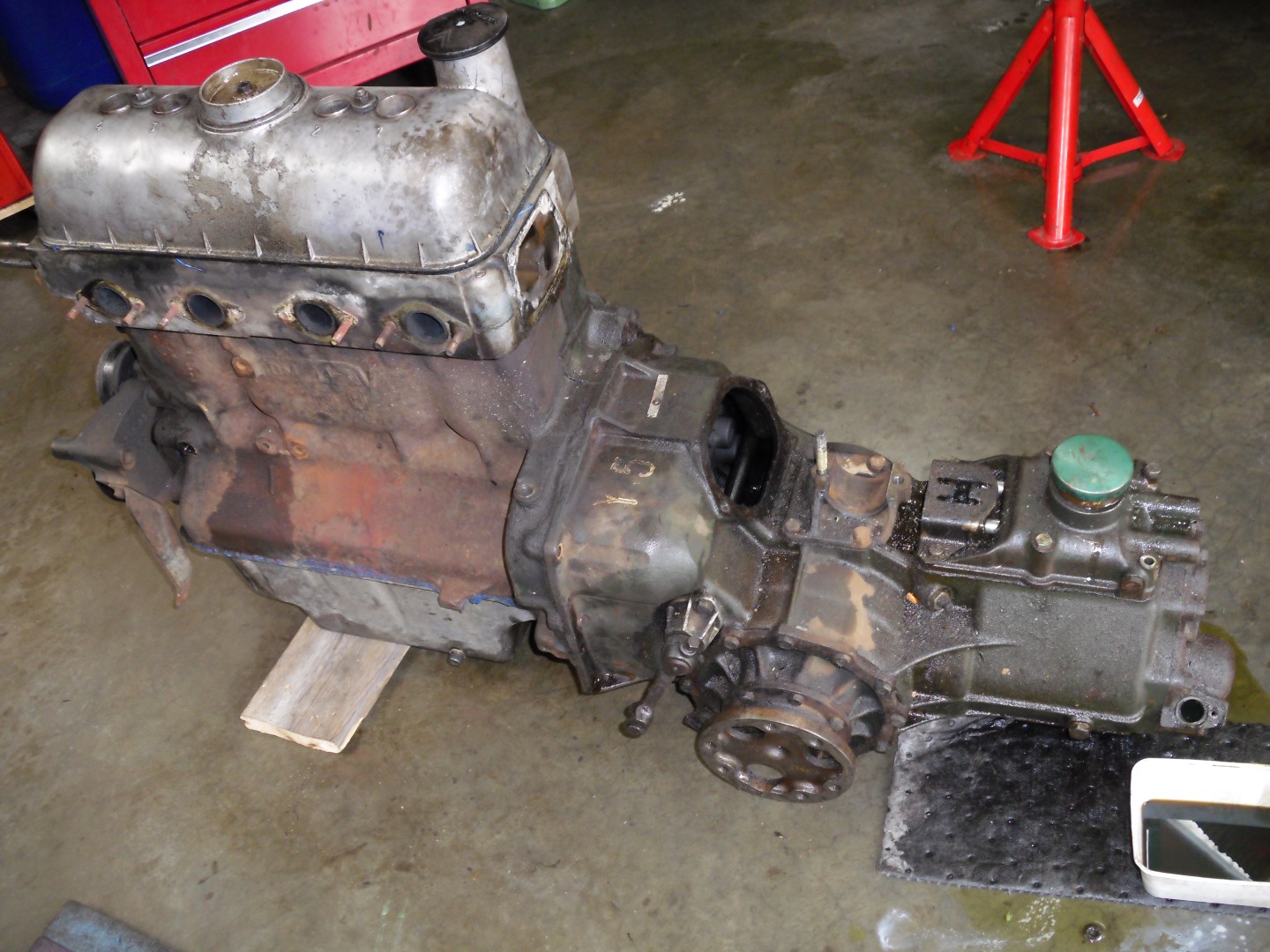Nog enkele plaatjes van de vorderingen, ik heb gisteren de gereviseerde motor en bak als één geheel ingebouwd. Bloed (letterlijk), zweet (en niet alleen van het zomerweertje) en net geen tranen :-)