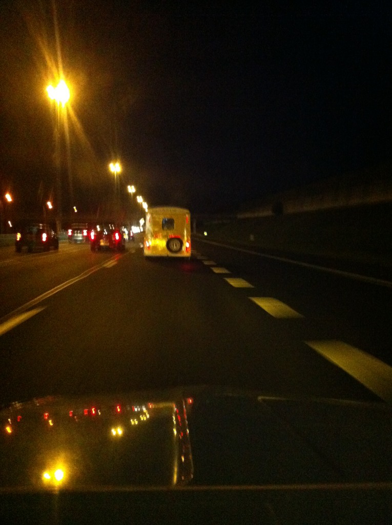 Heeeeel slecht te zien maar vanavond maakte deze HY weer het ouderwetse citrofielen gevoel in me los: ergens richting Tiel/arnhem kon ik er even met mijn Dyane achter plakken.