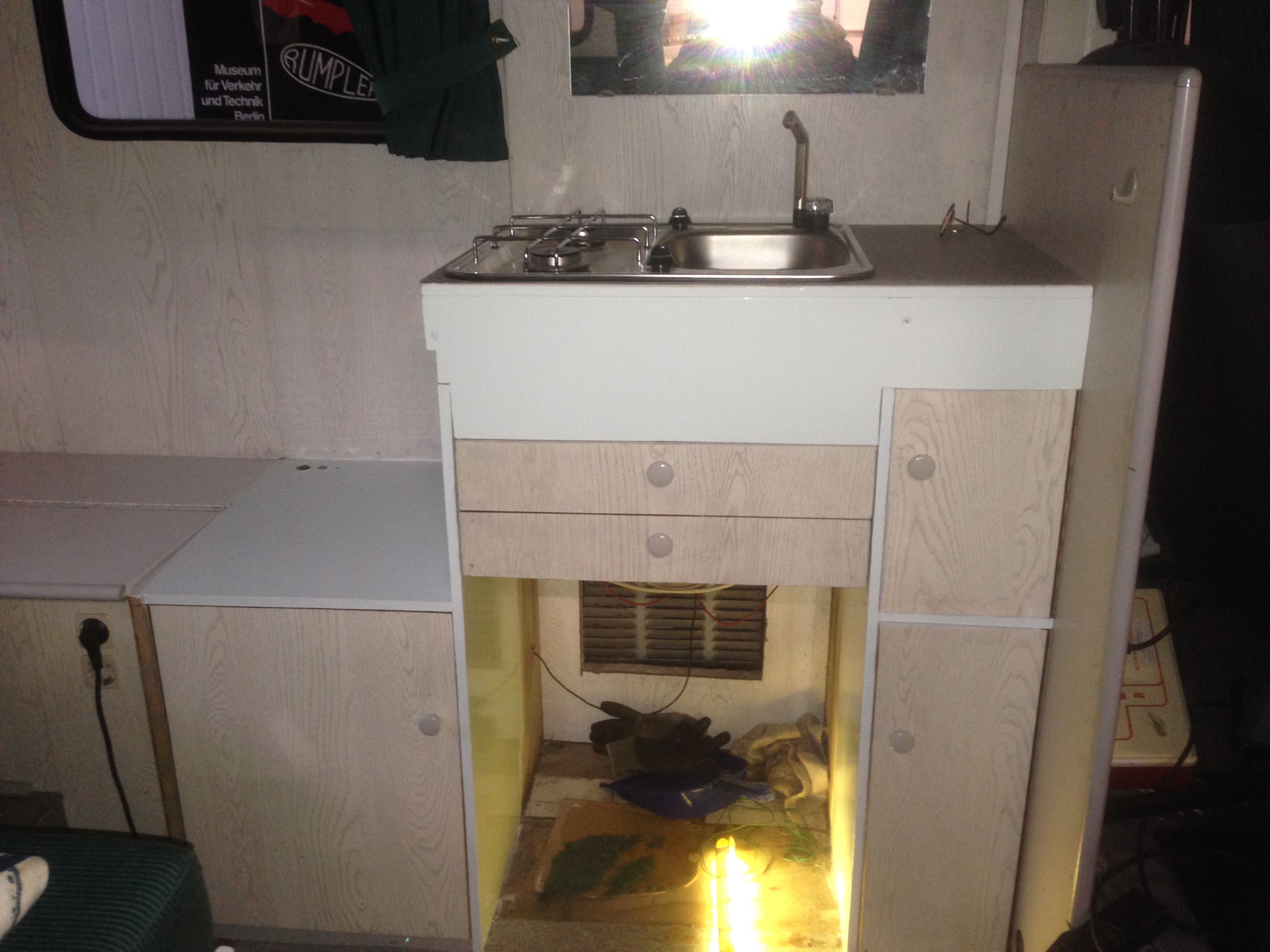 En dan ben ik ook nog bezig met de ombouw naar langsslaper. Daarvoor heb ik een nieuw aanrecht ingebouwd. Meer gericht op een 2-persoons huishouden..... alles aangesloten en werkt. Saillant detail: bij het aansluiten van de kraan (met een schakelcontact) deze rechtstreeks aangesloten op de + en de -. Nou die draadjes waren geen lang leven beschoren! En het schakelcontact dus ook naar de filistijnen. Nieuwe kraan dus, en nu aangesloten via de waterpomp. Minpuntje voor een elektrodocent