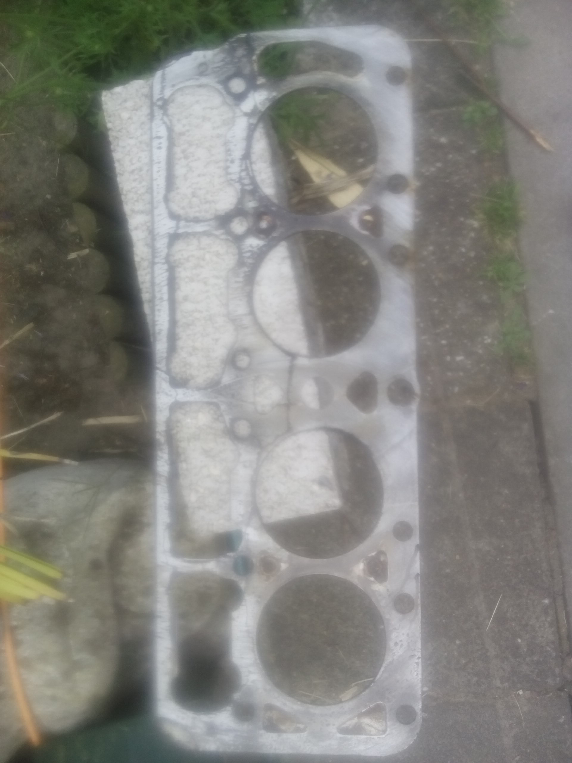 Die foto zegt genoeg. Lekkage tussen verbrandingsruimten van cilinder 1 en 2 (of 3 en 4) en ook naar een waterkanaal toe. Oorzaak van slecht starten, dieselgeluid en water verlies bij starten (2013) passen er allemaal bij. Als je oliedruk goed is en de de zuigerwanden onbeschadigd zijn zou ik de boel correct monteren en lekker gaan rijden. Vergeet niet de kopbouten na te trekken en de kleppen te stellen na 500 tot 1000 km. Het idee erachter is dat na een aantal keren opwarmen en afkoelen de koppakking wat ingedrukt wordt en de kopbouten wat ruimte krijgen met mogelijk sneller lekkage.