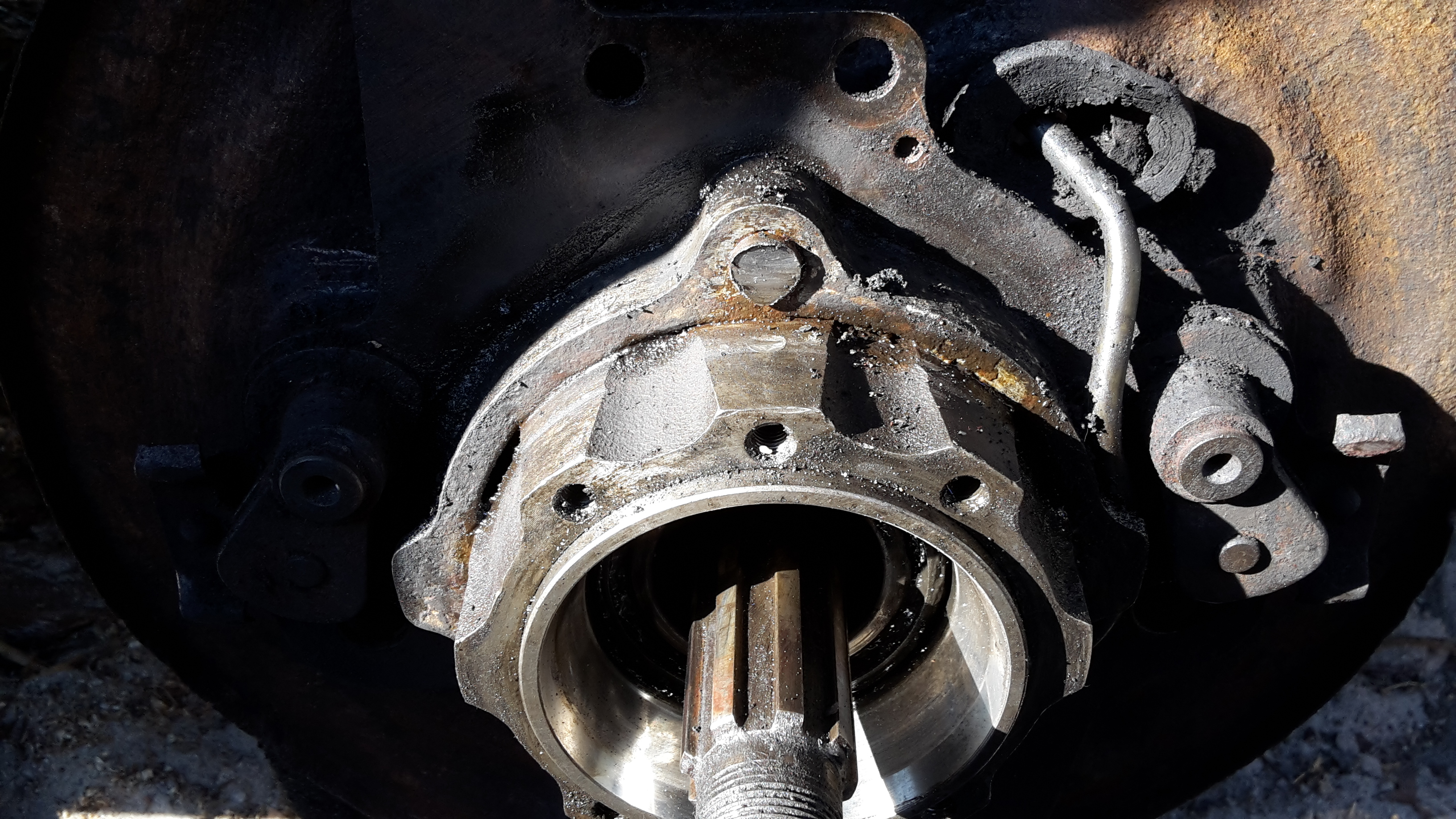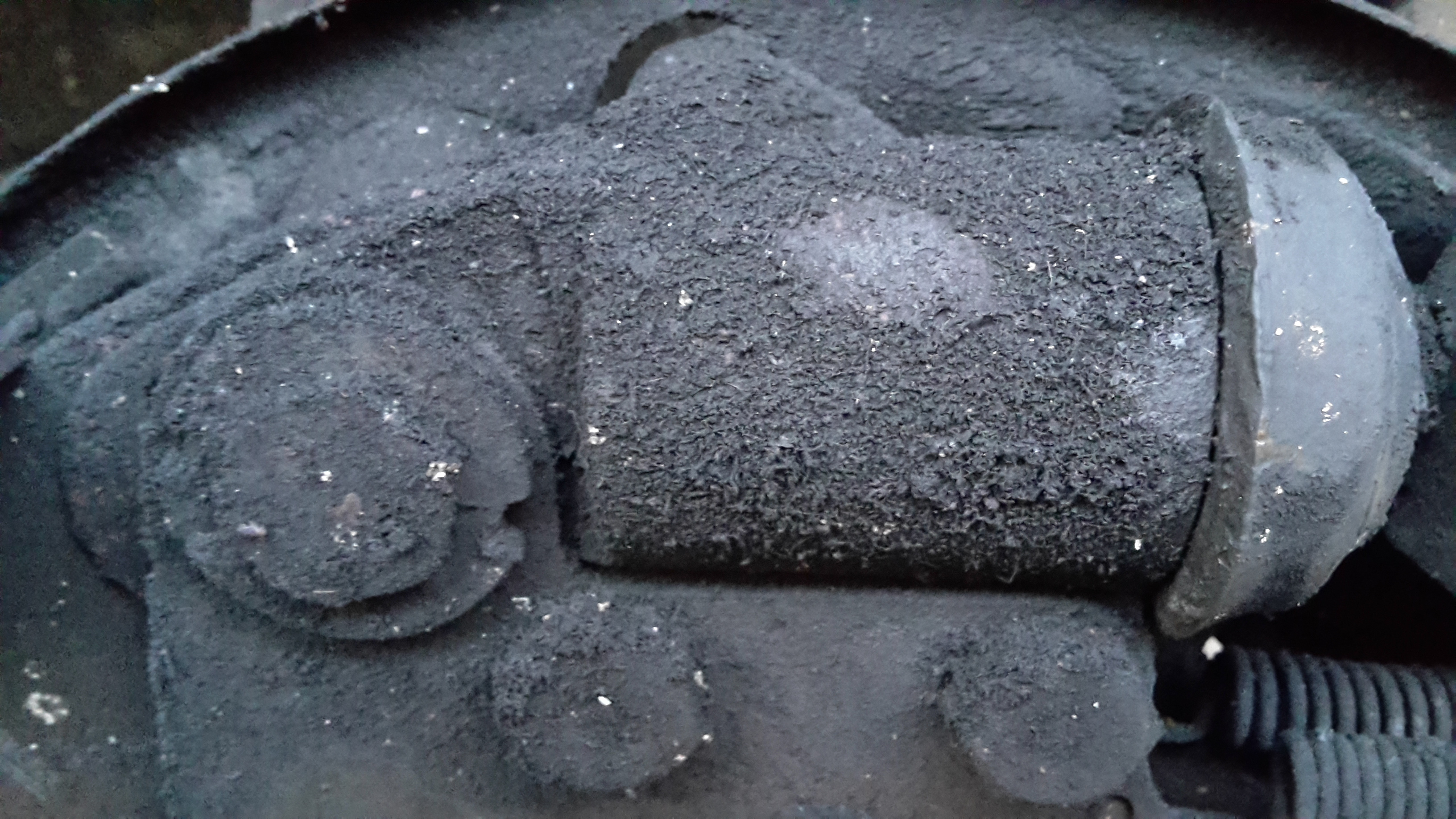 Afgelopen zaterdag in het magazijn geweest en weer wat tips en gereedschap ingewonnen. Zojuist beide achterste remstrommels eraf gehaald (zie foto's). Twee opvallende zaken: in beide wielen zat het binnenste lager los. En potverd@$$%!! ook hier lekte de cilinders (zeiknat achter de stofhoezen)!! 6 uit 6 dus. Dit kan toch geen toeval zijn!? Ik heb het rempedaal (zonder vloer) enkele keren volledig ingetrapt. Heb ergens gelezen dat dat eigenlijk niet de bedoeling is.