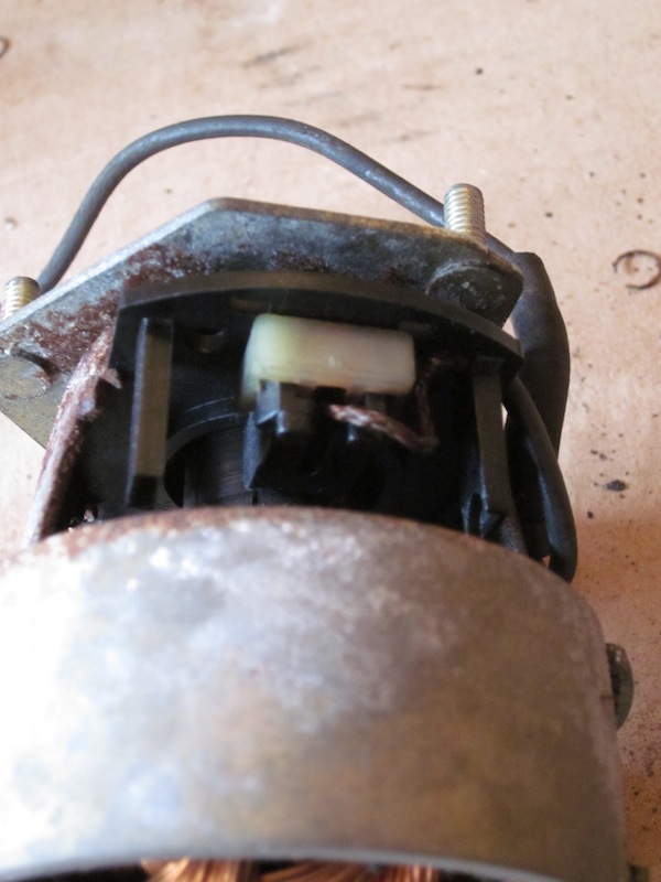 Een eerste blik op de motor leert dat de plastic klemmetjes die de koolstofborstel op zijn plaats houden nog heel zijn.