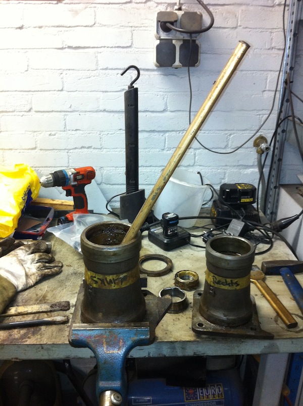 Dit gedeelte van de klus zag ik het meest tegenop. Ben heeft mooi gereedschap gemaakt en ik zag niet hoe ik dat zonder voor elkaar ging krijgen. Vooral de grote lagerschaal lijkt heel lastig omdat deze door een vrij grote rand in het huis heel weinig 'vlees' heeft om aan de trekken of duwen.