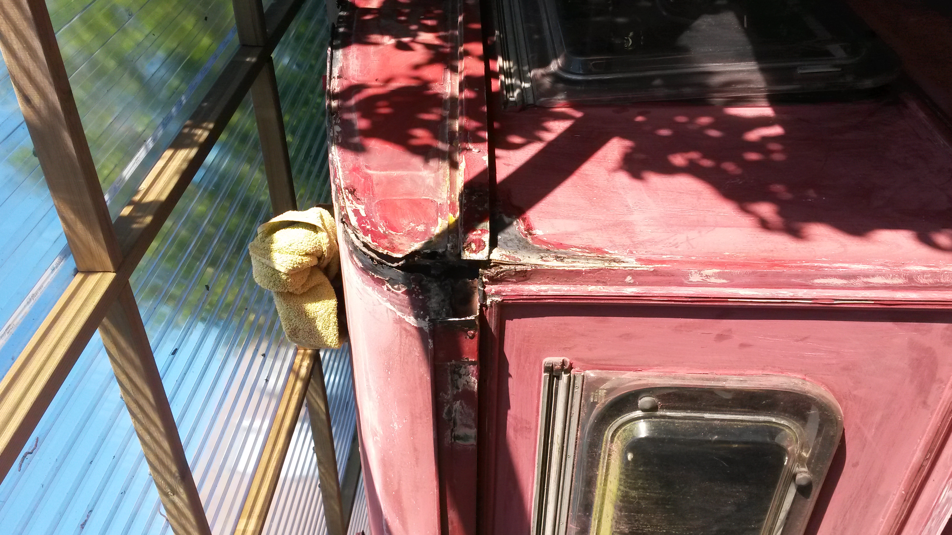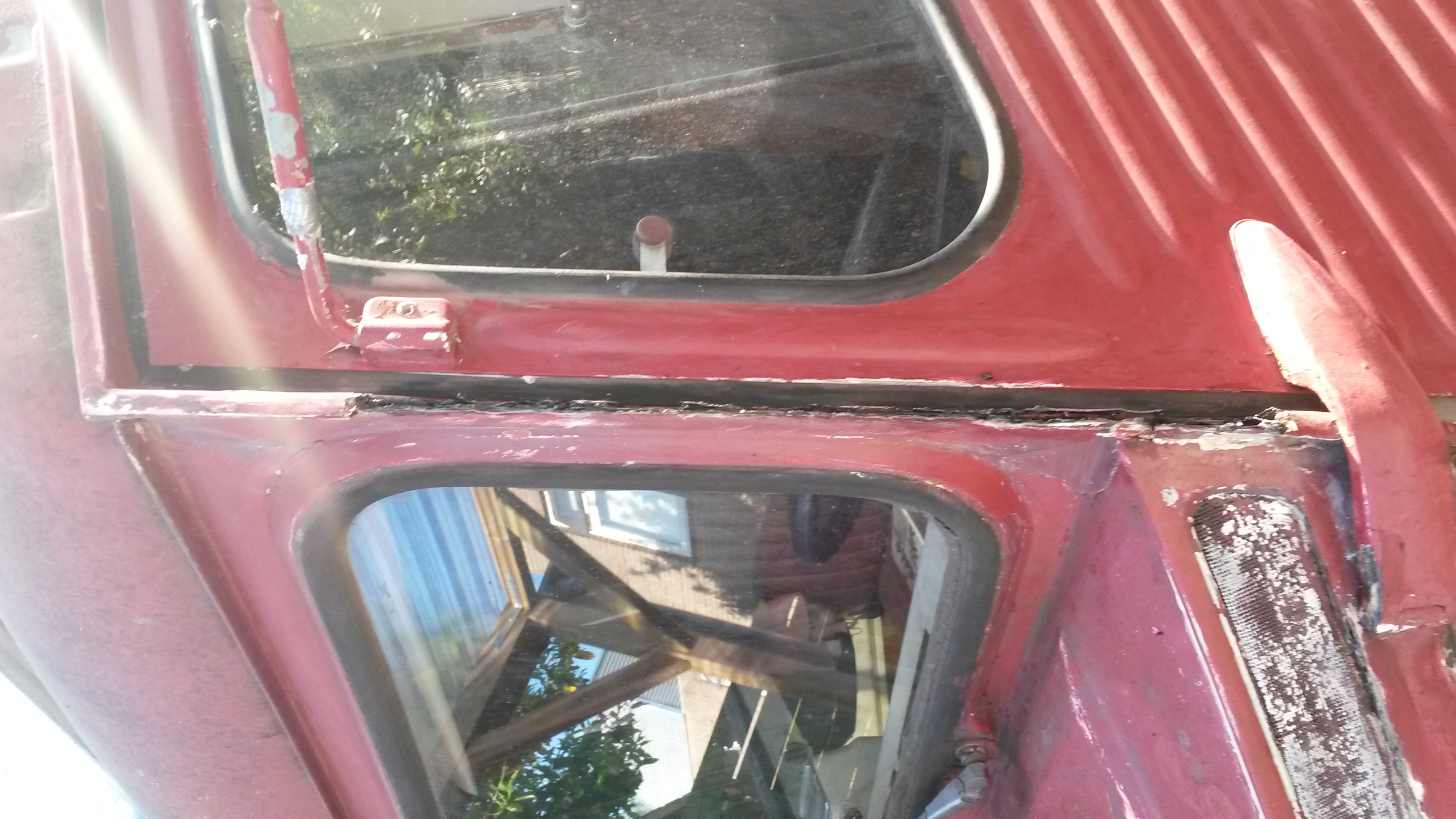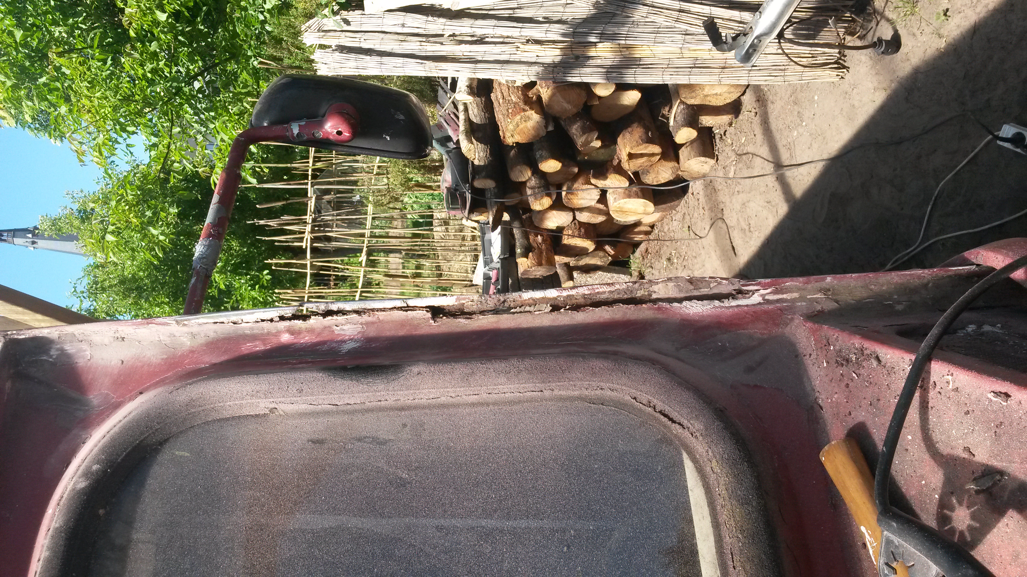 Nadat onze HY vorige maand een nieuwe motor heeft gekregen zijn we nu begonnen met een grote schuurbeurt onder het motto: liever nu grondig werk dan over een jaar of 2 wéér overal roestplekken. Het was nodig ook. Tussen een van de voordeuren en de voorruit is een groot deel compleet weggerot. Ook bij de dakhoeken is de bus zeer slecht. Achterop het dak heb ik een hele sleuf weg moeten slijpen. Was ook totaal rot. Dat verklaard dat binnen de kastjes krom begonnen te trekken.